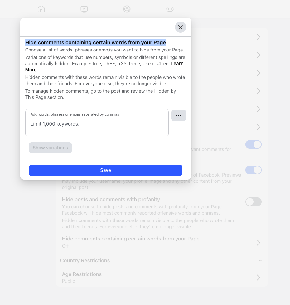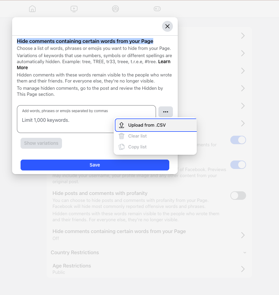 This feature allows you to create and upload a custom list of keywords, phrases, and emojis that you want to automatically hide from your Page's posts. Any comment containing a term from this list will be hidden from everyone except the commenter and their friends.